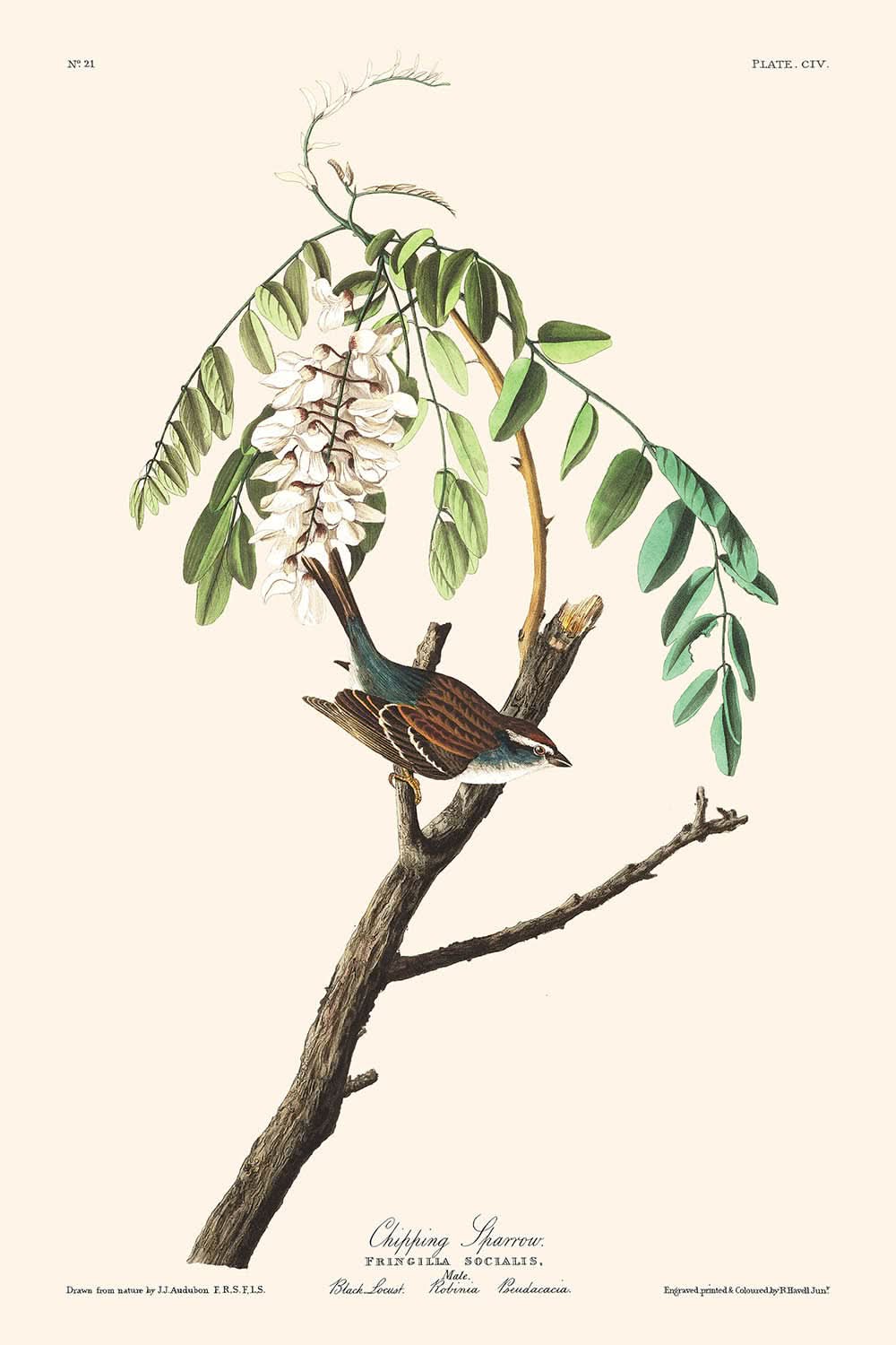 Step into the vibrant world of John James Audubon with this exquisite fine art print, the "Chipping Sparrow." Originally published in 1827, this bird illustration forms part of Audubon's monumental work, Birds of America. Renowned for his detailed, life-sized depictions of North American bird species, Audubon captures the essence of nature with a mix of scientific precision and artistic flair.
