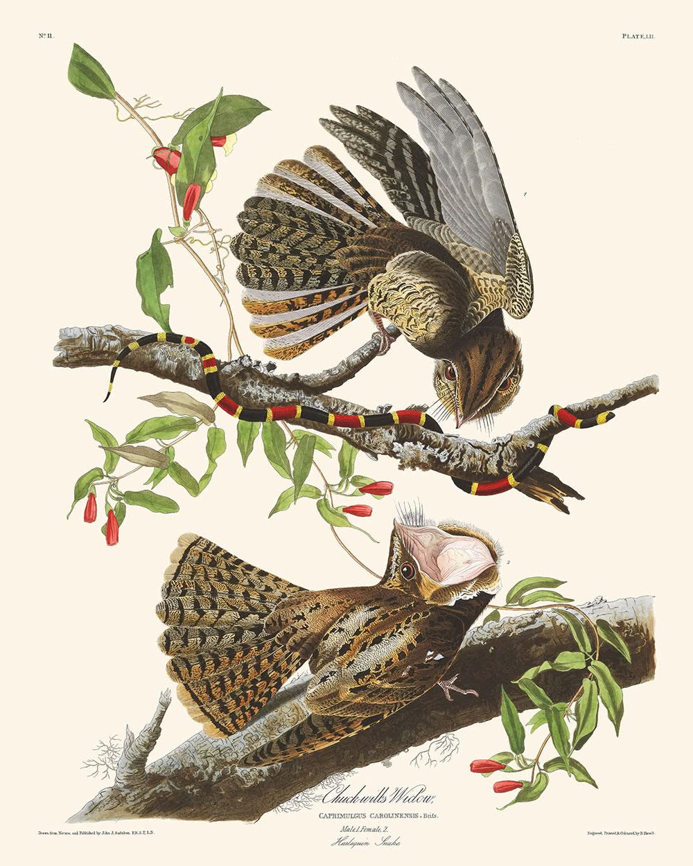The Chuck-will's Widow is particularly notable for its fascinating behavior and unique habitat, often found in the deep ravines and swamps of the southeastern United States. Scientifically known as Caprimulgus Carolinensis, this bird's haunting calls echo throughout the forests at dusk, adding a mysterious yet soothing quality to its surroundings. This print captures a serene nighttime scene where the birds interact with a harmless Harlequin Snake on a decayed branch, highlighting Audubon's dynamic portrayal of wildlife.