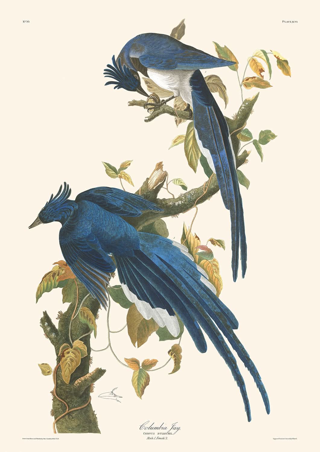 Columbia Jay, first introduced in 1827, is one of the captivating illustrations from John James Audubon’s renowned work, The Birds of America. Known for its striking blue plumage with purple reflections, this splendid bird—the Columbia Jay—has intrigued naturalists and art lovers alike.