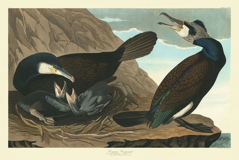 Common Cormorant, Phalacrocorax Carbo. Plate CCLXVI by John James Audubon, first published in 1827, is a splendid illustration capturing the essence of avian life. This plate from the renowned double elephant folio Birds of America depicts a male and female common cormorant with their two hatchlings, perched serenely above the tumultuous ocean waves.