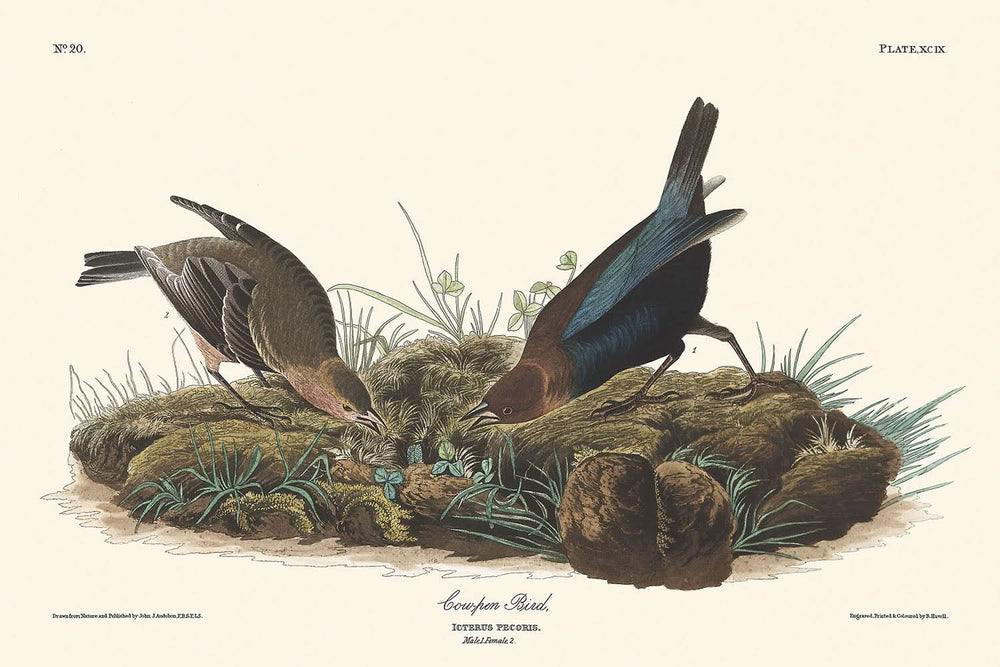 Cow-pen Bird, known for its captivating depiction by John James Audubon, was first published in 1827 as part of his iconic series "The Birds of America." Renowned for his meticulous attention to detail and vivid representation of avian life, Audubon brings forth the enigmatic Cow-pen Bird through this exquisite illustration, capturing its unique behaviors and subtle intricacies.