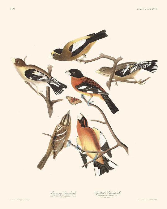 Evening Grosbeak and Spotted Grosbeak, first published in 1827, is a captivating illustration by the renowned ornithologist and artist, John James Audubon. Known for his detailed studies of North American birds, Audubon captures the beauty and elusive nature of these species in his celebrated work, Birds of America.
