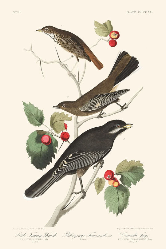 Little Tawny Thrush, Ptiliogony's Townsendi, Canada Jay by John James Audubon, first published in 1827, is a captivating illustration from the renowned Birds of America series. Known for his meticulous attention to detail and lifelike depictions of avian species, Audubon captured the essence of the Little Tawny Thrush and the Canada Jay with remarkable precision, showcasing their distinctive features and habitats.