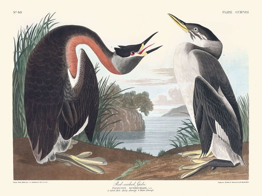 This illustration stands out for its meticulousness in depicting the grebe’s unique features, such as the bright red neck, bill structure, and glossy plumage. The use of color not only highlights the bird's striking appearance but also reflects Audubon's dedication to capturing the intricacies of bird anatomy and behavior. Owning this print connects you to a rich tradition of ornithological study and artistic mastery.