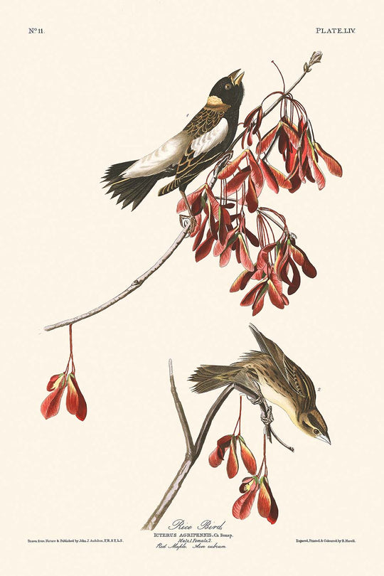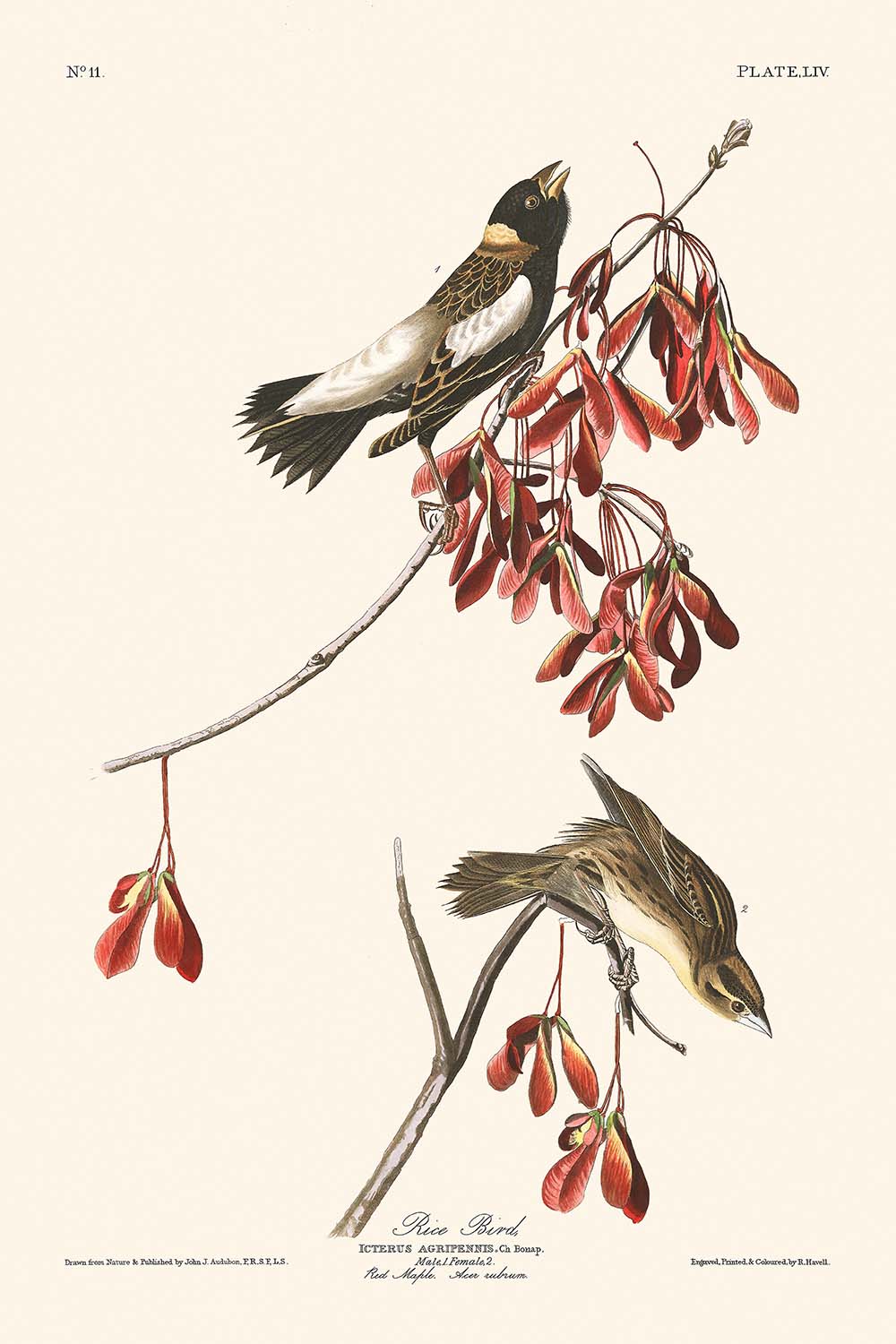 As a leading figure of American ornithology and art, John James Audubon was celebrated for his intense realism and vivid artistic portrayal of birds. His work in "Birds of America" serves as an invaluable repository of bird species that complements both scientific study and artistic appreciation. The "Rice Bird (Plate 54)" depicts one of the migratory birds that is both a visual and auditory delight in various parts of the United States.