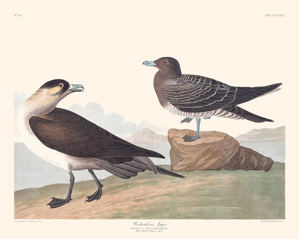 Renowned ornithologist and artist John James Audubon rendered the majestic "Richardson's Jager" as part of his groundbreaking work, "Birds of America," published in 1827. This striking illustration immortalizes the rare presence of the Richardson's Jaeger on the North American coastlines, especially detailed against the crisp winter backdrop of Massachusetts and Maine.