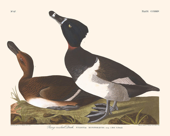 John James Audubon, a leading figure in early American natural science illustration, achieved an unmatched level of recognition for his precise depictions of bird life, embedding deep respect and fascination for wildlife. This artwork stands out, illustrating the Ring-necked Duck's exquisite features — from the bold black plumage with subtle blue-grey and reddish accentuations enveloping the neck, to the delicate ash colorations on its flanks, artistically rendered against a serene and natural backdrop.