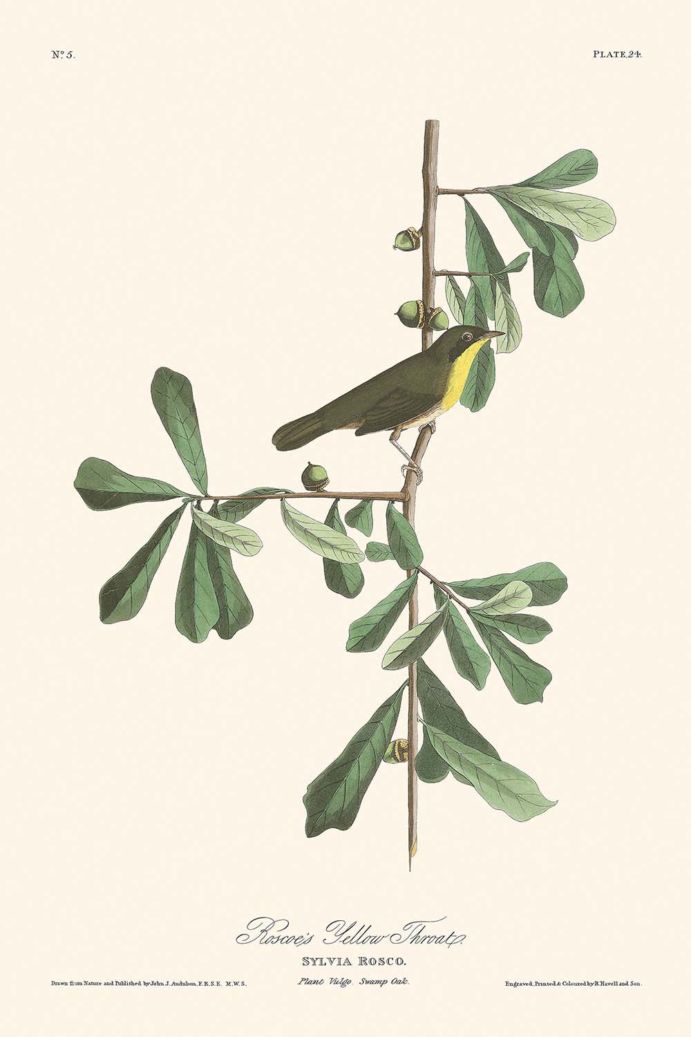 "Roscoe's Yellow-throat (Plate 24)" is a captivating bird illustration created by the renowned artist John James Audubon in 1827. This artwork is part of Audubon's famous collection, "Birds of America", which is celebrated for its detailed and lifelike representations of American bird species. At the time of its creation, Audubon's work revolutionized ornithological art by offering one of the first comprehensive and accurate depictions of North American birds.