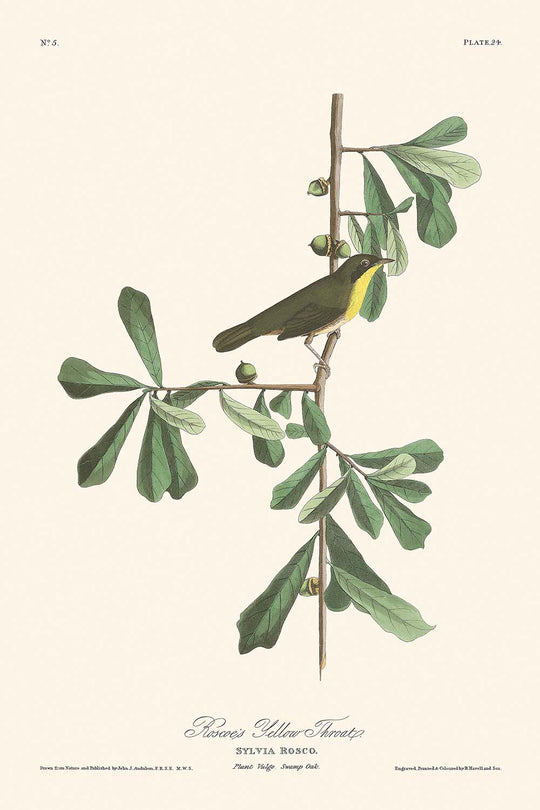 John James Audubon is revered as one of the world's most preeminent naturalists and wildlife artists. His contributions laid the foundation for modern ornithology. "Roscoe's Yellow-throat" is notable for its precise depictions, capturing not only the visual details but also bringing to life the vivacious spirit of this bird species, known scientifically as Geothlypis philadelphia.