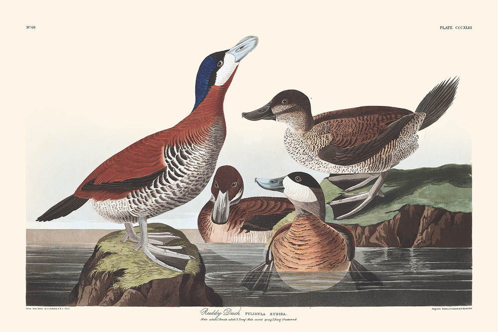 The "Ruddy Duck" showcases Audubon's keen observation of the species, Fuligula rubida, recognized for their unique appearance and distinctive lifestyle. With highlights of warm chestnut browns, deep blacks, and subtle creams, this scene captures the robust energy and grace of the duck, amid a natural setting where its behaviors are thoroughly documented—diving and surface skimming, all carefully illustrated.