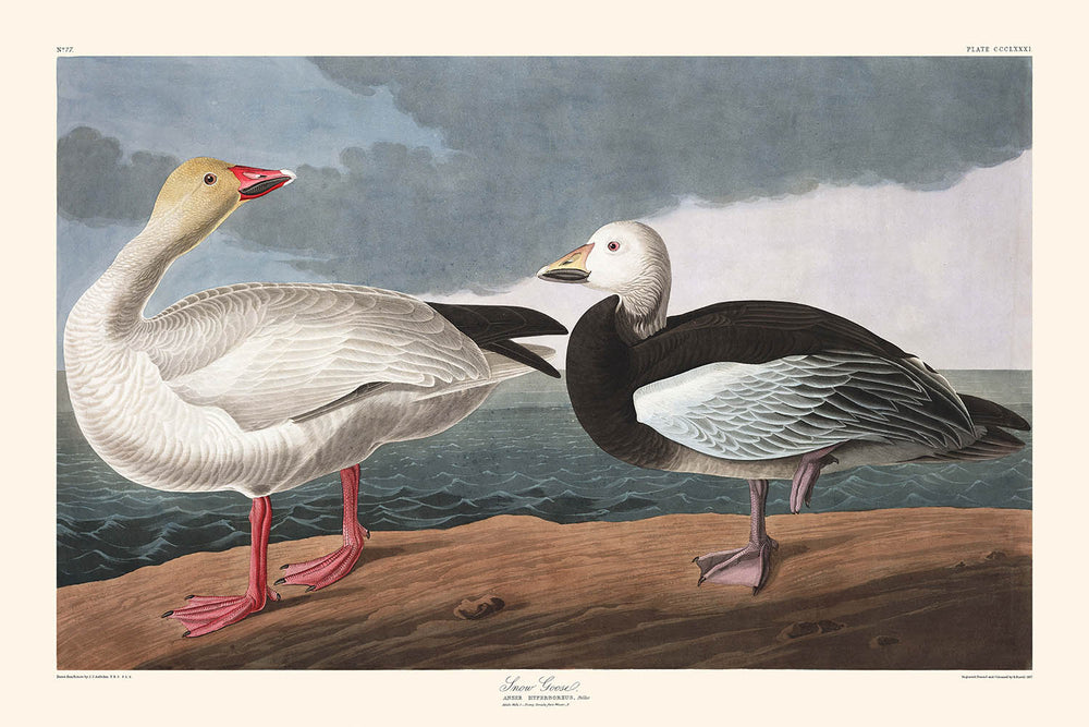 The illustration vividly presents the snow goose in its natural environment, emphasizing striking details that bring the artwork to life. Gentle hues of whites and greys dominate the piece, with splashes of subtle blue and warm tones enhancing the authenticity of the bird’s plumage and habitat. This careful attention to color highlights Audubon’s unique talent, making this print a desirable piece for enthusiasts of nature and art alike.