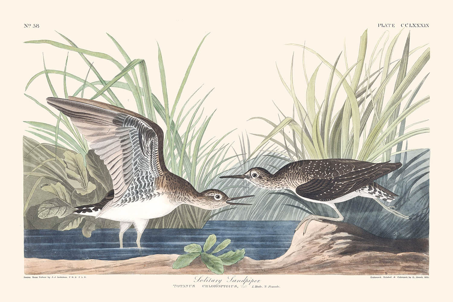 The "Solitary Sandpiper" by John James Audubon, first published in 1827, captures the elegance of this distinctive bird as part of his renowned "Birds of America" series. This fine art reproduction allows enthusiasts to admire the detail and mastery of Audubon, a pivotal figure in ornithological illustration and ecological discovery. Known for his exhaustive studies of American bird life, Audubon meticulously outlined each species' natural behavior and habitat, transforming them into these vibrant depictions.