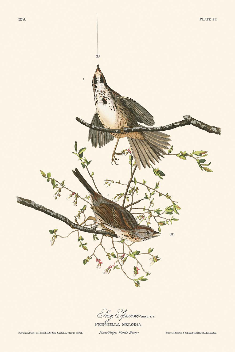 John James Audubon's "Song Sparrow (Plate 25)," published in 1827, is a remarkable avian illustration from his renowned series, Birds of America. Audubon was a prolific naturalist and painter who dedicated his life's work to documenting wildlife, notably avian species. His meticulous artistry has made his illustrations celebrated collectibles among art enthusiasts and nature lovers alike.