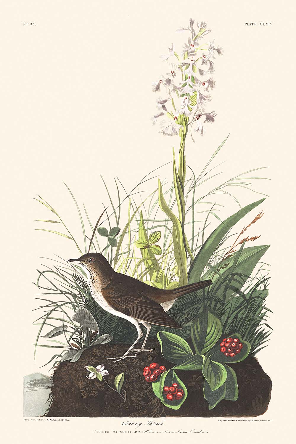 This print captures the striking colour palette featuring the tawny brown feathers of the Thrush, accented with olive-brown on its wings and tail. The depiction of this thrush in its unobtrusive habitat imbues the piece with a gentle tranquility, drawing viewers into the serene world where the bird resides. The attention to fine detail reflects Audubon's commitment to scientific accuracy and artistry, making this an exceptional piece to own.