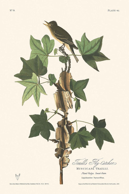 The richness of Audubon’s use of color in this print is striking. The bird is portrayed in distinct grey and dusky olive tones, its refined lines and delicate highlights embodying the quiet elegance specific to this flycatcher. The surrounding sweet gum foliage, accurately depicted with its palmate leaves and rugged texture, adds an additional layer of rich green hues and tones, creating a lush canvas and a serene setting for the bird. The image is elevated by splashes of light and shadow, delivering an evocative presentation that draws the viewer into its tranquil realm.