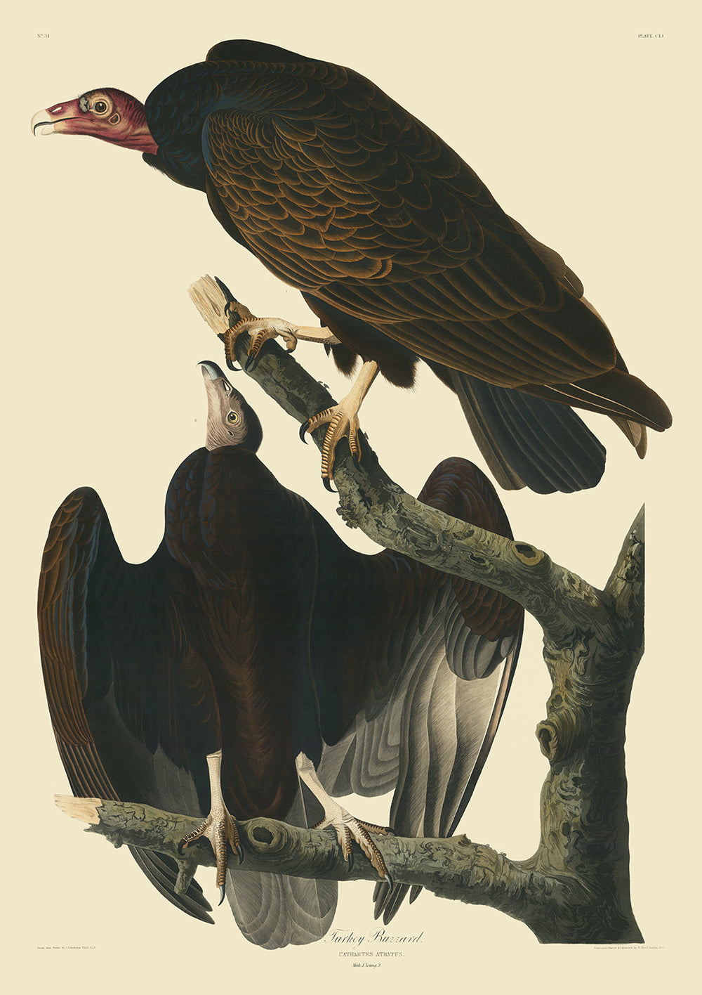"Turkey Buzzard. Cathartes Atratus. Plate CLI," first published in 1827, is a magnificent and intricately detailed illustration by John James Audubon, from his monumental work, The Birds of America. This exceptional double-elephant plate from the first edition features the Turkey Buzzard (Cathartes Atratus) in a poised and captivating scene.