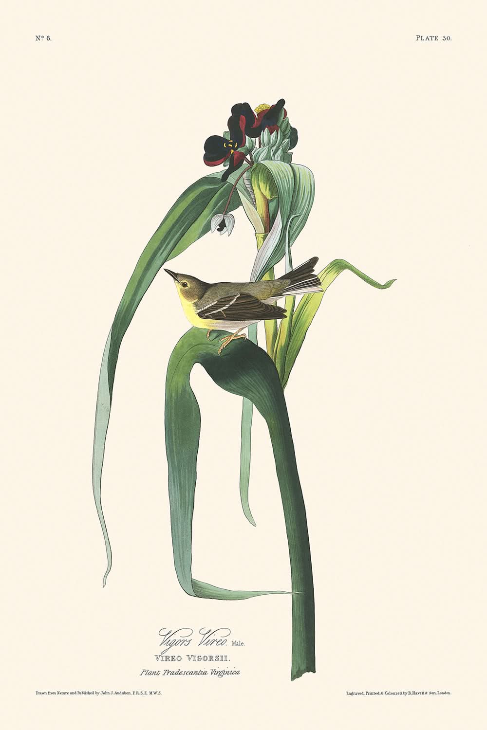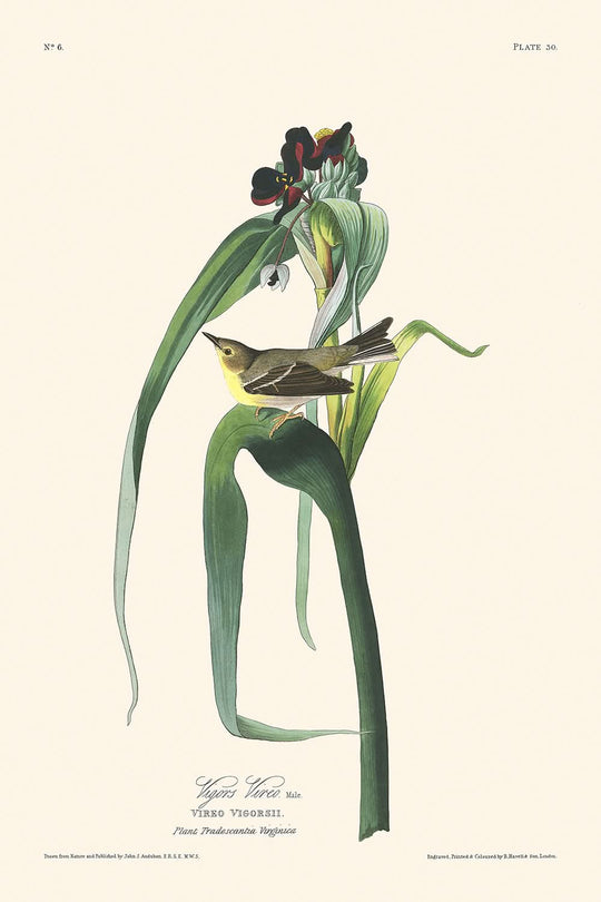 Vigors Vireo, first published in 1827, is a captivating illustration from John James Audubon's illustrious series, "The Birds of America." This collection remains one of the most prominent achievements in ornithological art, showcasing Audubon's remarkable ability to capture the vibrancy and essence of bird life.
