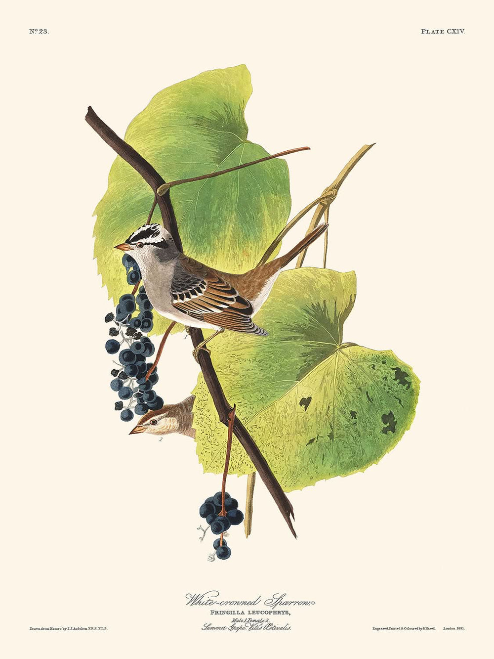 The "White-crowned Sparrow" illustration, rendered with exquisite detail by John James Audubon, was first published in 1827 as part of his magnum opus, Birds of America. This stunning depiction captures Audubon's commitment to capturing the natural beauty and the spirit of avian life in North America's wild landscapes.