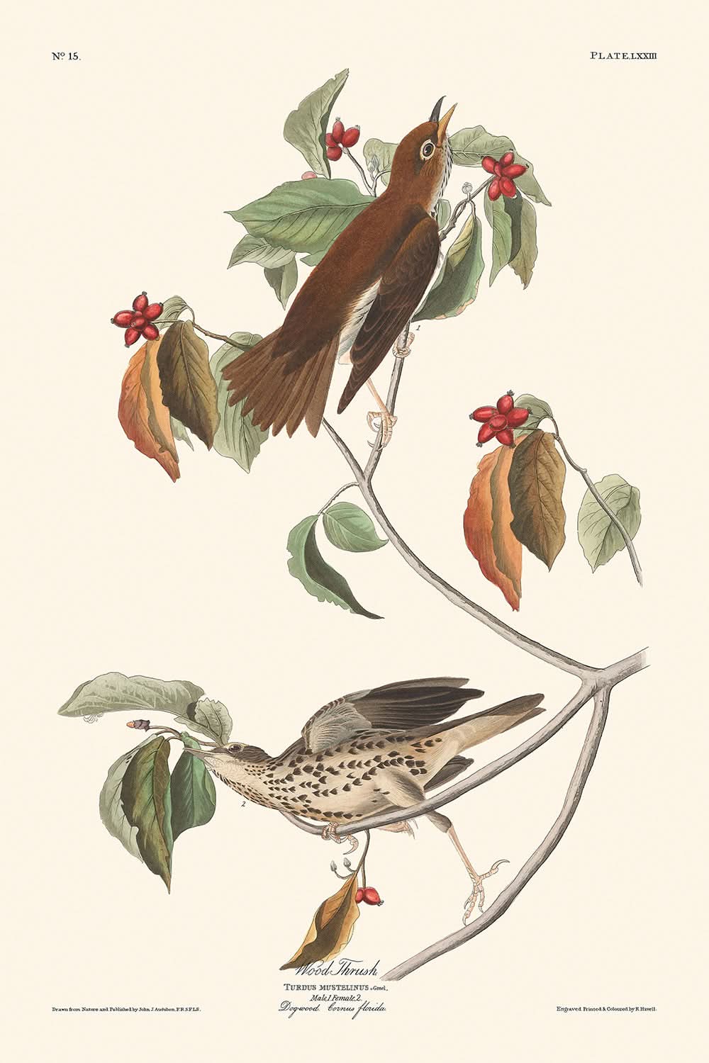 Wood Thrush (Plate 73) by John James Audubon, first published in 1827, is one of the most heartfelt and resonant illustrations from Audubon's esteemed collection, The Birds of America. Celebrated for the intricate details and profound connection with natural habitats, this piece highlights Audubon's deep personal attachment to the Wood Thrush, expressed through delicate strokes and vibrant colors.