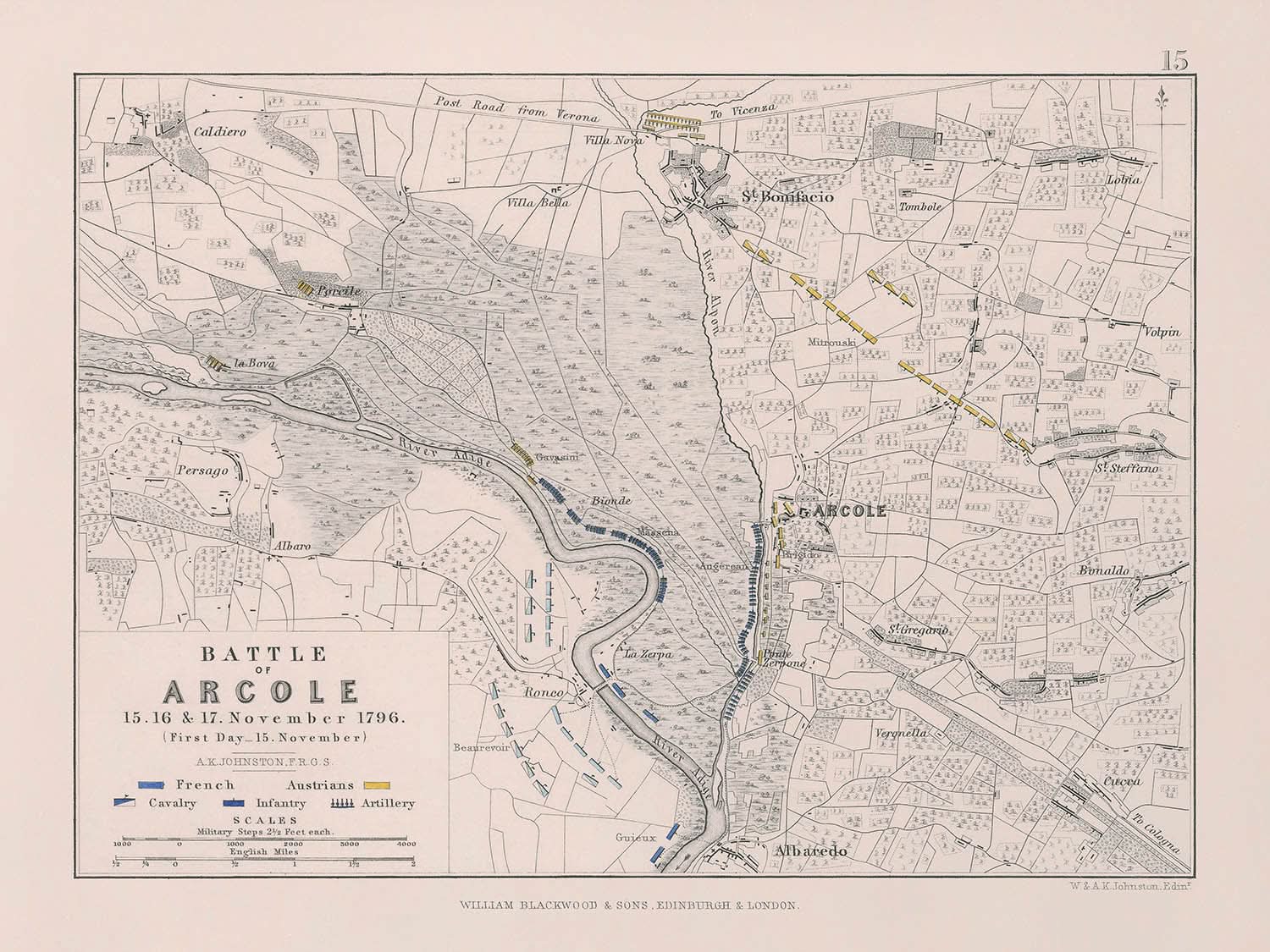 Introducing the intriguing "Battle of Arcole, 15 16 & 17 November 1796 (first day - 15 November)," an antique colour lithograph expertly crafted by AK Johnston. This exquisite hand-colored battle plan vividly illustrates the strategic positions of French and Austrian forces during the first day of this infamous battle. Utilize this elegant piece to explore the historic military engagements that shaped the era from the French Revolution to the Bourbon Restoration.