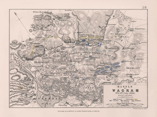 AK Johnston was integral to the art of cartography in the early 19th century, extensively publishing maps and atlases that were essential to understanding historical geographies. The "Battle of Wagram" lithograph is particularly notable for its intricate detailing, which vividly reconstructs the movements of the French and Austrian units. The artwork's historical significance is only heightened with the accurate portrayal of military strategies that occurred during Napoleon Bonaparte's campaigns, engaging with the complexities of early 19th-century European history.