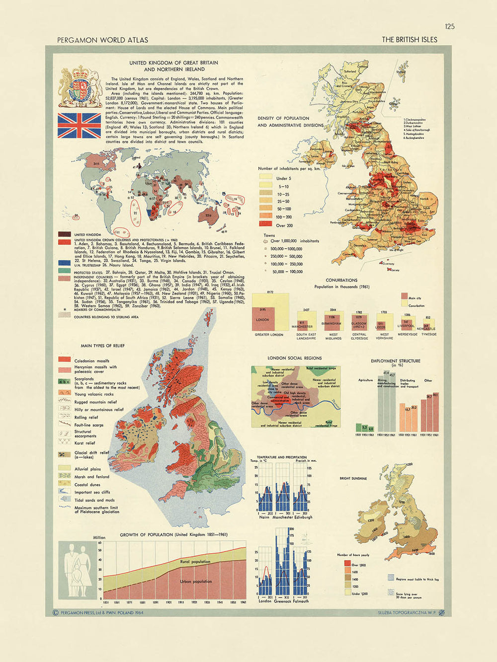 Old Infographic Map of the British Isles, 1967: Population Density, Climate Variation, Employment Statistics