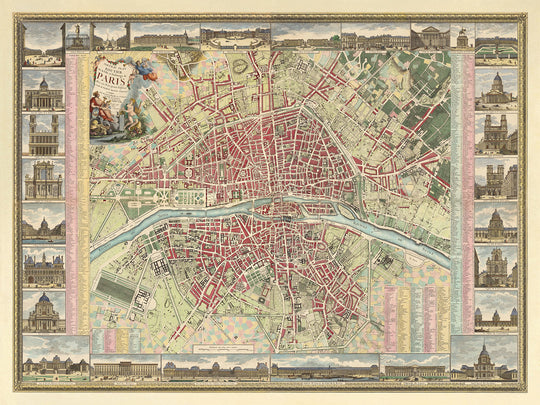 - Design/Style: Floral border; title cartouche showing angels and an allegory of Paris with the symbols of the arts and sciences; 28 inset illustrations of places and landmarks