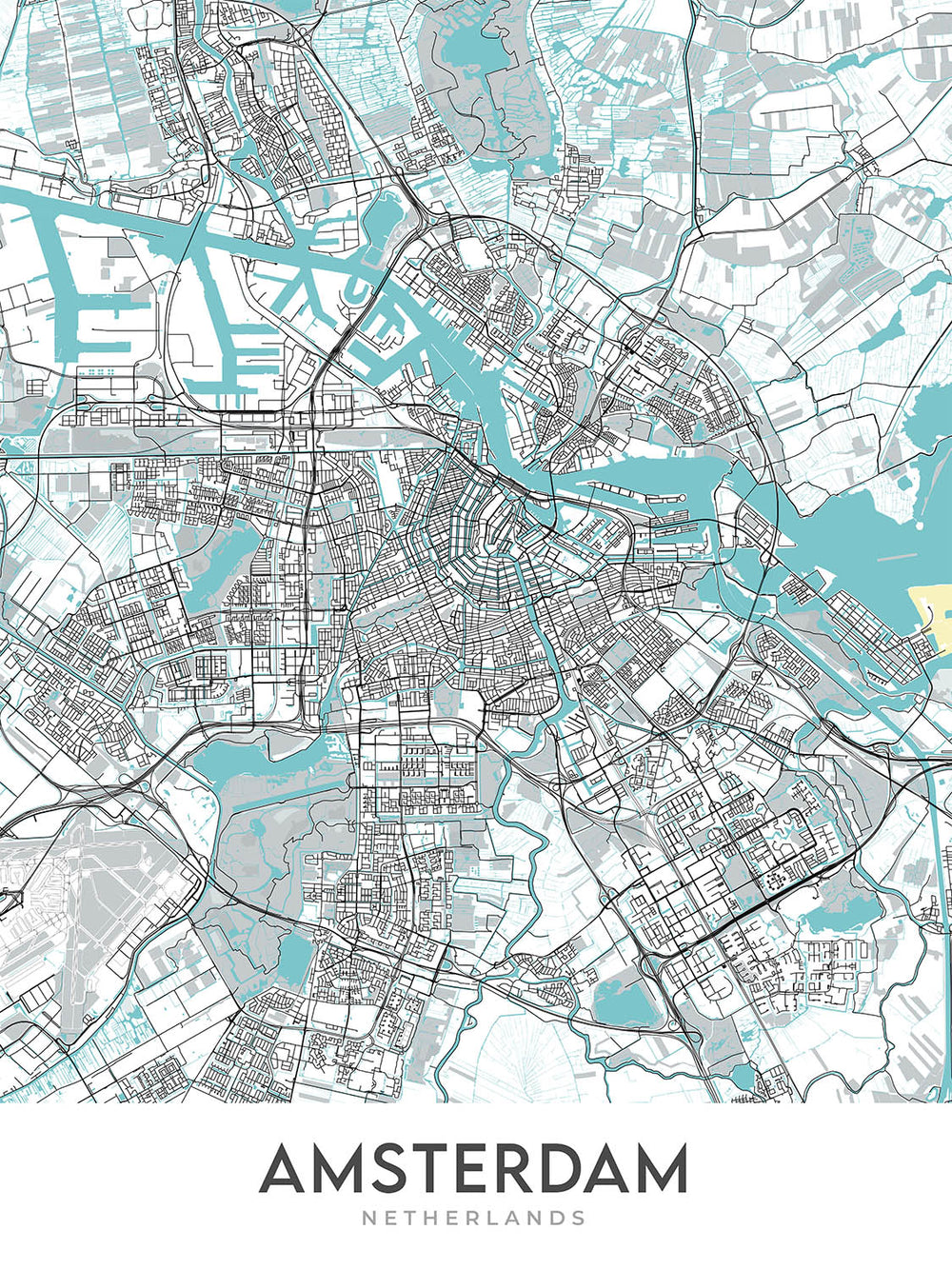 This map of Amsterdam is a modern, detailed street map that focuses on the city's unique neighborhoods and landmarks. The map covers a large area of the city, including the city center, the surrounding neighborhoods, and some of the suburbs. The map is designed to be both informative and visually appealing, making it a great addition to any home or office.