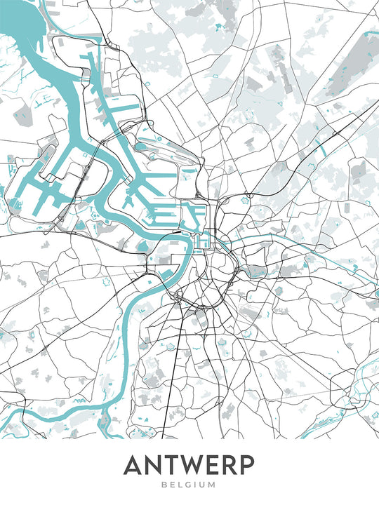 Modern City Map of Antwerp, Belgium: Central Station, Cathedral, City Hall, Zoo, Diamond District
