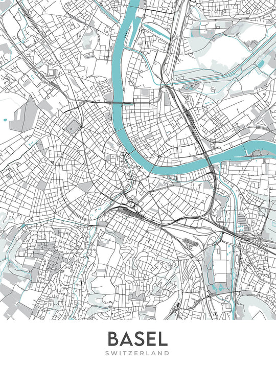 Modern City Map of Basel, Switzerland: Altstadt, Basel Cathedral, Zoo, University, Rhine River
