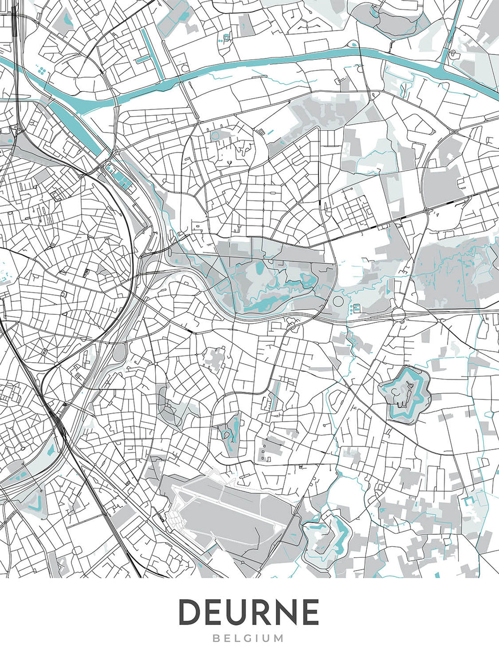 Modern City Map of Deurne, Belgium: Town Hall, Rivierenhof Park, Luchtbal Sports Complex, A12, N13