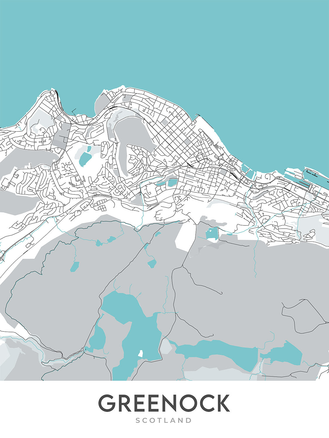 Discover the charm and intricate layout of Greenock with this exquisite modern city map created by The Unique Maps Co. in 2024. This meticulously designed map showcases the heart of Greenock, spanning several of its most vibrant neighbourhoods. From the bustling Greenock Town Centre to the serene expanses of the West End, each area is captured with precision and elegance. The map offers a bird's eye view of Greenock’s detailed street network, skillfully illustrating the urban landscape without the clutter of labels, enabling viewers to appreciate the pure cartographic artistry.