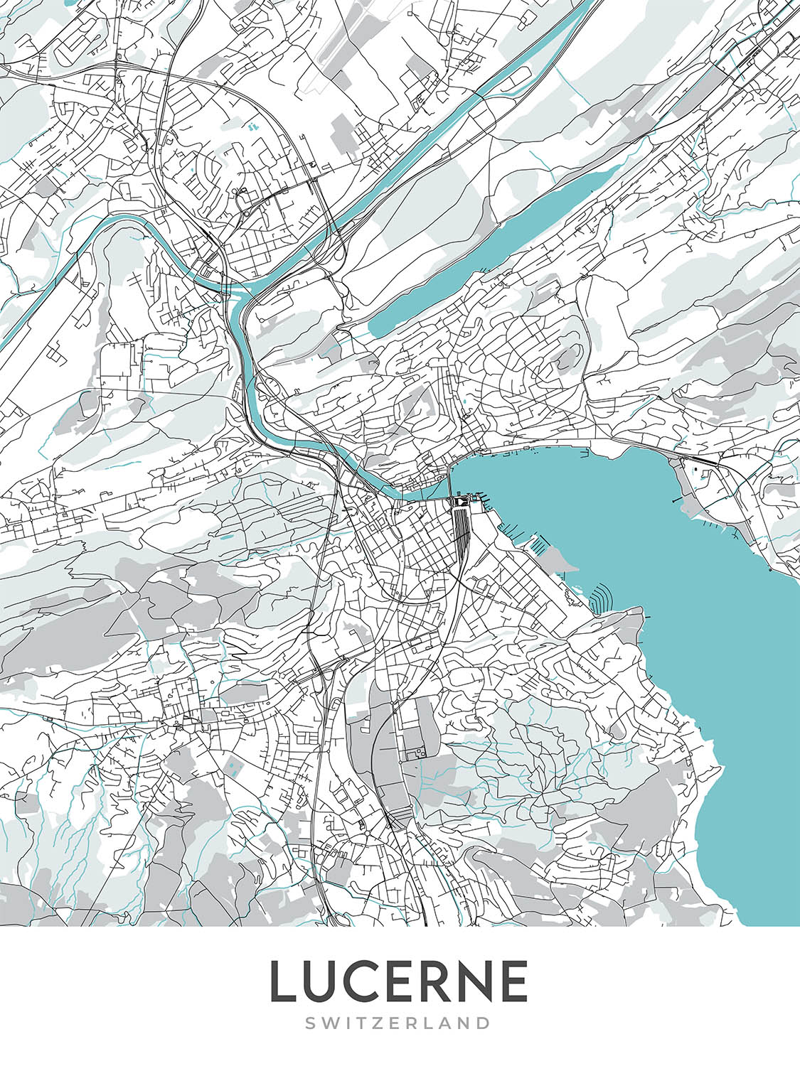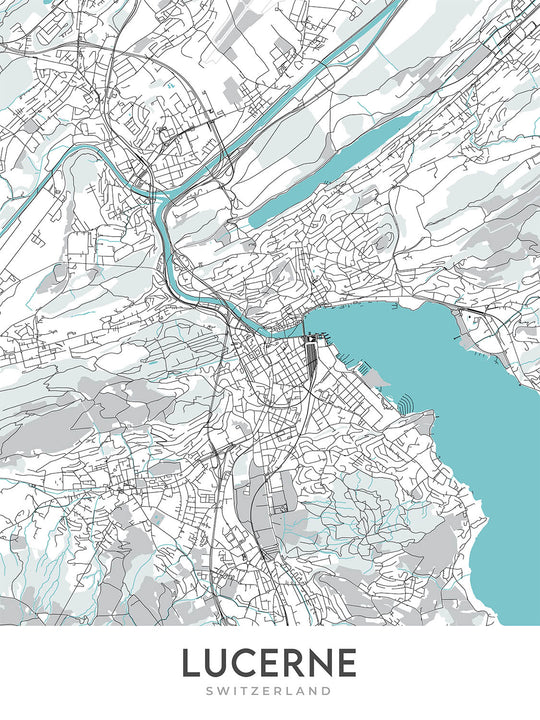 The map showcases Lucerne's urban landscape, capturing the city's essence and spirit. The intricate details and clean lines make it a visually striking piece. The muted color palette adds a touch of sophistication and elegance, making it suitable for various interior design styles.