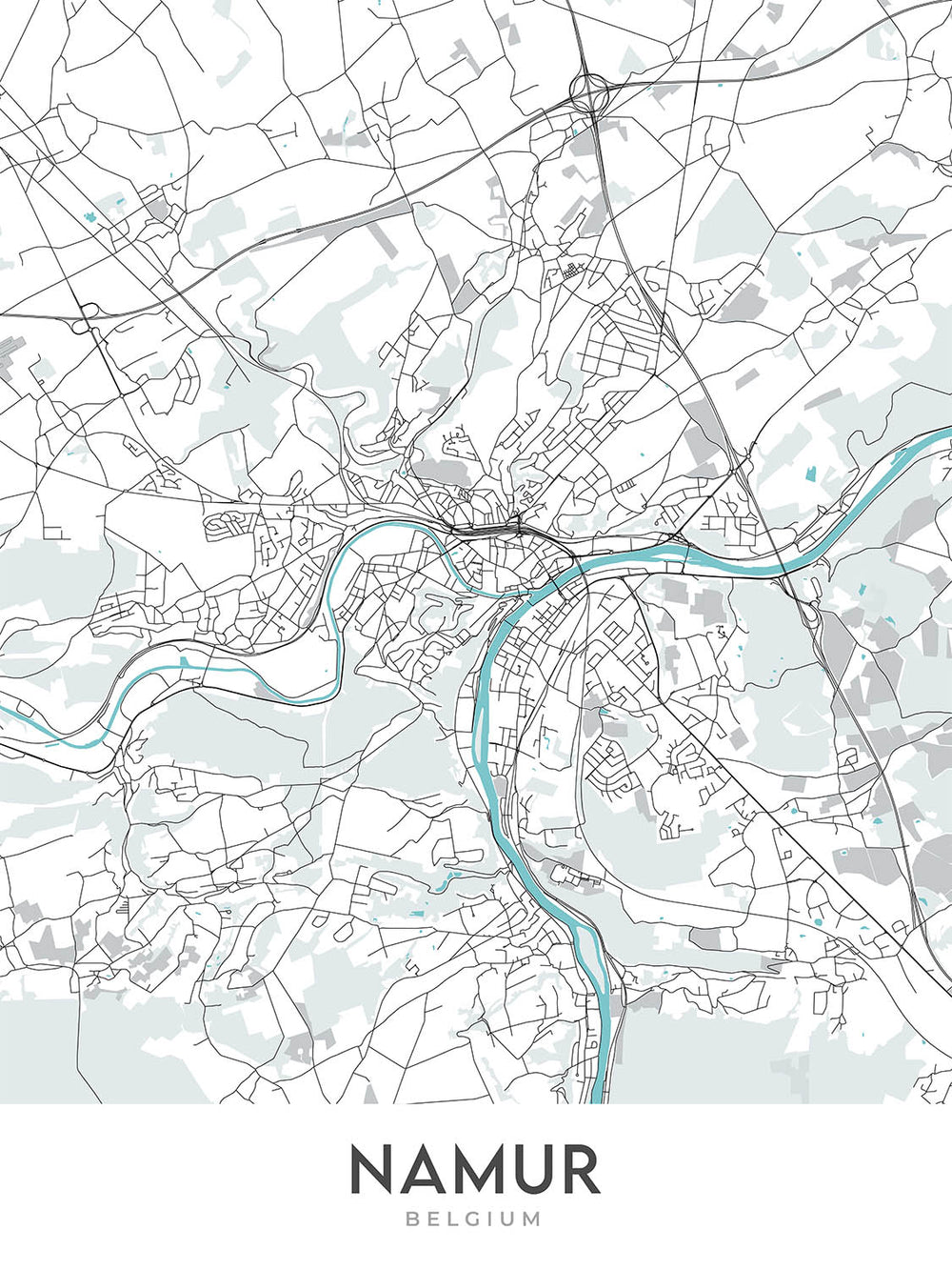 This map of Namur, Belgium, is a modern and detailed cartographic artwork that is perfect for any home or office. The map is centered on the city of Namur, and it extends to include the surrounding countryside. The map is drawn in a modern style, with a focus on clean lines and simple shapes. The color palette is muted and earth-toned, which gives the map a sophisticated and timeless look.