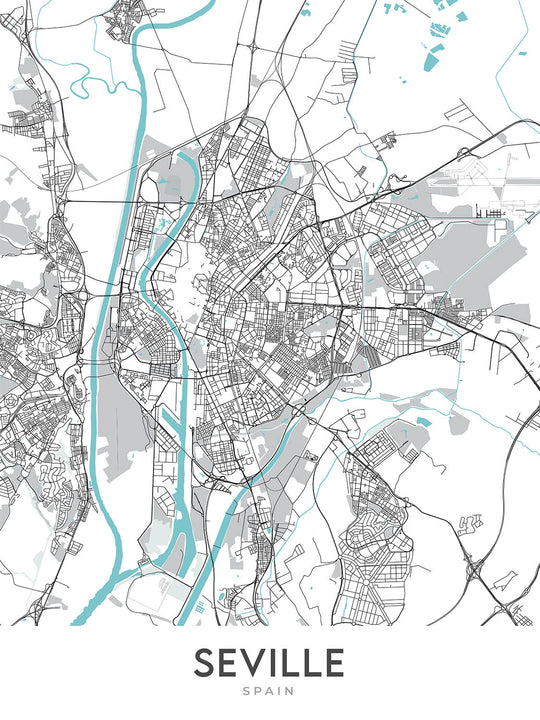 This map of Seville, Spain, is a modern cartographic artwork that will be a stylish addition to any home or office. The map focuses on the city of Seville and the surrounding area, providing a detailed look at the city's neighborhoods, major roads, and landmarks. The map is a great conversation starter and a perfect way to add a touch of sophistication to any room.