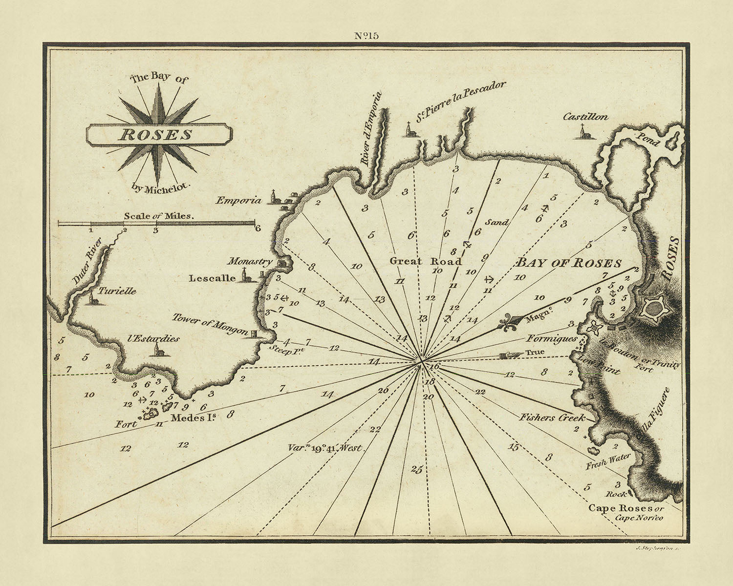 Delve into the rich maritime history of the Mediterranean with the exquisite 1802 chart, "The Bay of Roses," crafted by the renowned British cartographer William Heather. This chart is a significant piece from Heather's ambitious project, The New Mediterranean Pilot..., which marked the first English endeavor to systematically map the Mediterranean's ports—a venture previously dominated by French, Italian, and Spanish cartographers. Heather's work stands out for its meticulous detail and the superior quality of its engravings, a testament to the finesse achieved by the London engraver John Stephenson, whose monogram adorns this chart.