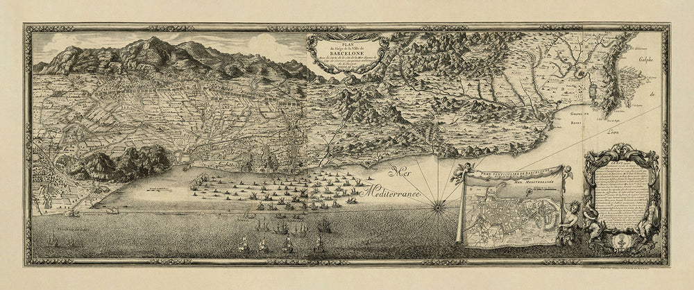 This exquisite map, "Plan du siége de la ville de Barcelone," crafted by the renowned Sébastien Pontault de Beaulieu in 1697, offers a captivating glimpse into the historical siege of Barcelona. As a masterful bird's-eye view, it intricately details the strategic military maneuvers of the French forces during the War of the Grand Alliance. The map spans the Mediterranean coastline from Cap Cerbère to the Llobregat River, showcasing the meticulous planning and disposition of troops as they besieged this vital city. The artistry and precision of Beaulieu's work provide both an informative and visually stunning representation of this pivotal moment in European history.