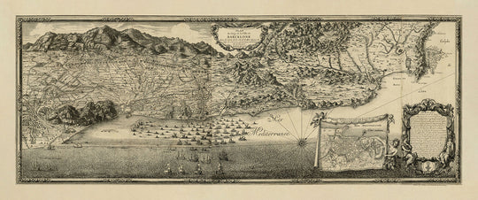 The map's design reflects the rich cartographic traditions of the late 17th century, blending artistic flair with military precision. The pictorial relief vividly illustrates the region's topography, highlighting the mountainous terrain and strategic coastal positions. Notably, the map includes detailed depictions of siege lines, fortifications, and naval forces in the Mediterranean Sea, offering a comprehensive view of the conflict's complexity. Beaulieu's attention to detail extends to the artistic borders and decorative elements, which enhance the map's aesthetic appeal and historical value.