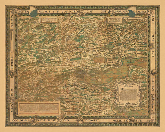 Jodocus Murer's map is not just a geographical representation but a historical document that narrates the story of Zurich. The cartouches on the map provide valuable historical context, including a dedication to Bishop Otto von Friezinger and a detailed history of the canton of Zurich. The map delineates administrative boundaries with dotted lines, showcasing the political landscape of the time. The hilly and mountainous terrain, along with the many lakes and rivers, are vividly illustrated, offering a comprehensive view of the region's natural features.