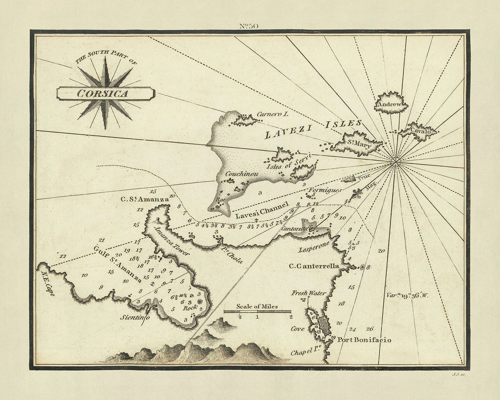 William Heather's chart is oriented uniquely with southeast at the top, a choice that highlights the strategic navigational routes of the time. The inclusion of soundings—measurements of water depth—is particularly valuable, reflecting the chart's utility for mariners navigating the perilous Mediterranean waters. Moreover, the chart details the topographical features such as the imposing mountains and expansive forests of Corsica, providing a comprehensive view that goes beyond mere navigation to encapsulate the natural beauty of the island.