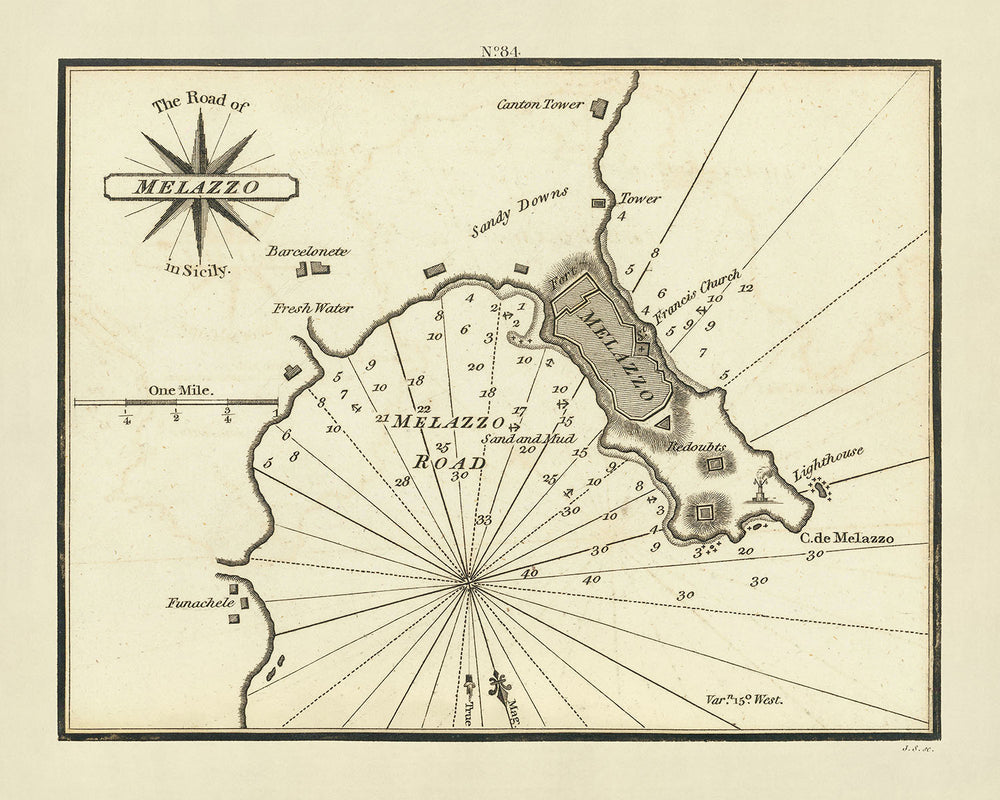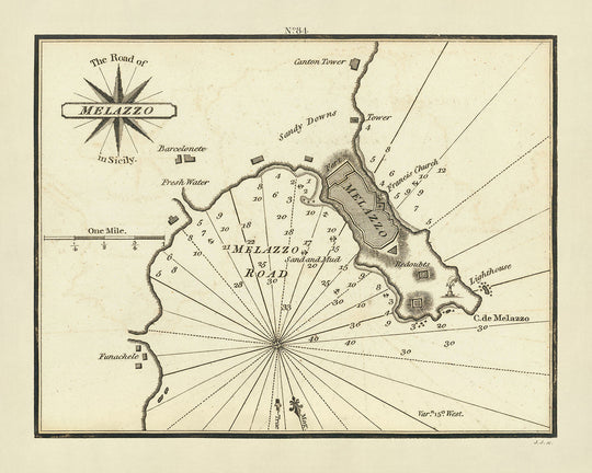 The Road of Melazzo is distinguished by its precise inclusion of various maritime and topographical features. The chart meticulously documents soundings in fathoms, enabling mariners to understand the depths and underwater terrain of the area, crucial for safe navigation. It also highlights the directional currents and water channels, providing insights into the dynamic marine environment of the Gulf of Melazzo. The inclusion of the compass rose further aids in orienting the sailors, enhancing the chart's utility as a navigational tool.