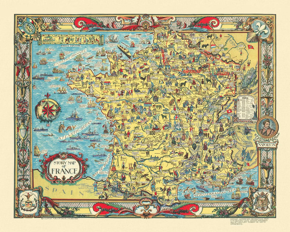 • Themes and topics: Thematic and pictorial representation of France with cultural, historical, and geographical features.