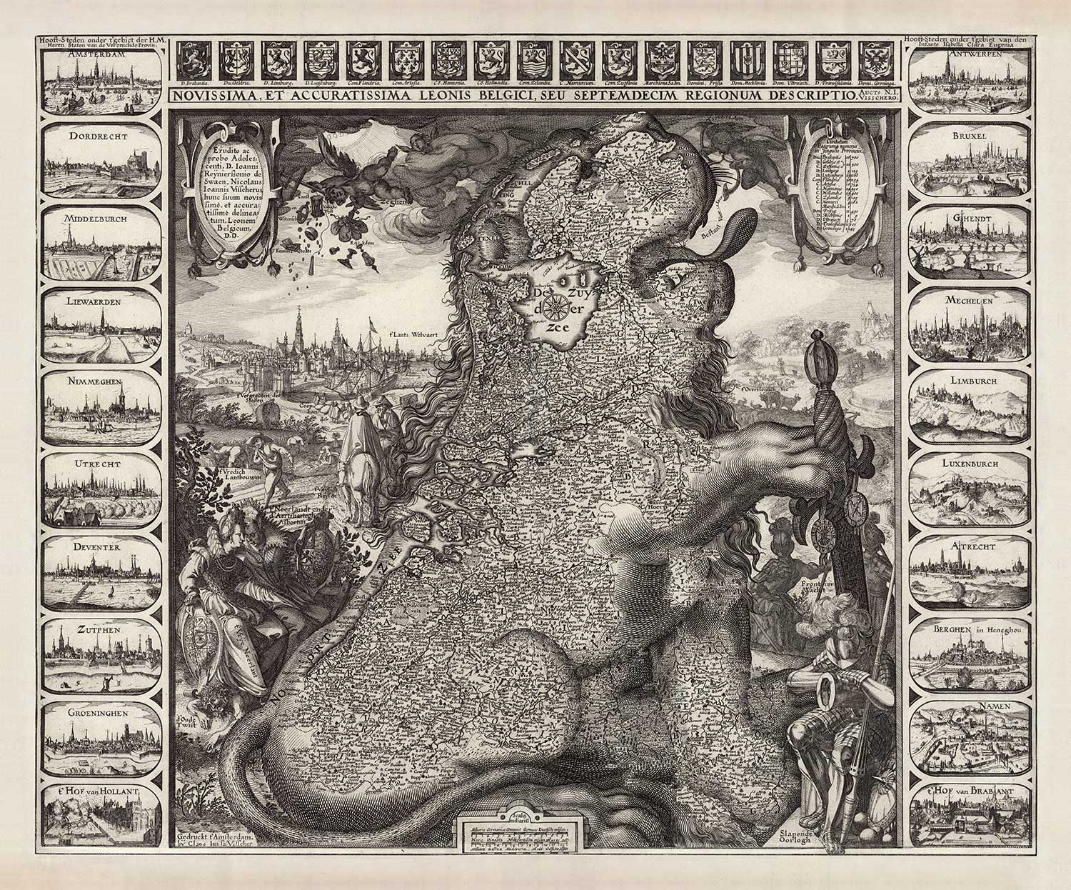 Old Leo Belgicus Map of the Low Countries in 1611 by C. Janszoon Visscher: Netherlands, Belgium, Brussels, Amsterdam, Genk
