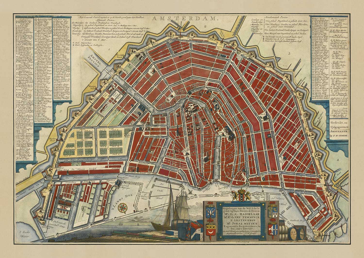 This wonderful old map of Amsterdam was originally published in 1766. It was created by Frederik Willem Greebe.