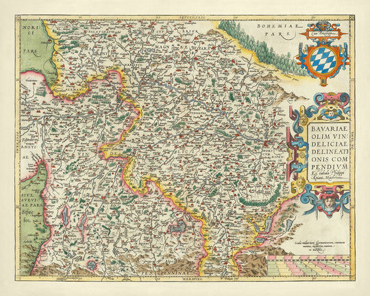 "Bavariae, Olim Vindeliciae Delineationis Compendium Ex tabula Philippi Apiani Math" is a masterful creation by the renowned cartographer Abraham Ortelius, crafted in 1579. This exquisite map offers a detailed representation of Bavaria, showcasing the region's intricate network of rivers, including the prominent Danube and Donau Rivers. Extending from the majestic German Alps to the northern reaches of Nuremberg and Freiburg, this map captures the essence of 16th-century Bavaria with remarkable precision and artistry. The meticulous detailing of physical and political features makes this map not only a geographical guide but also a historical artifact.