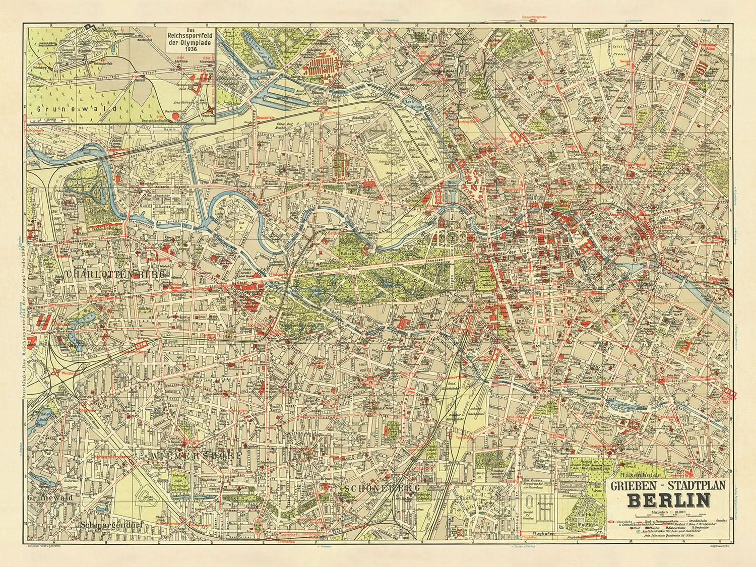 Old Map of Berlin by Stilke, 1936: Olympics, Grunewald, Tiergarten, Kurfürstendamm, Unter den Linden