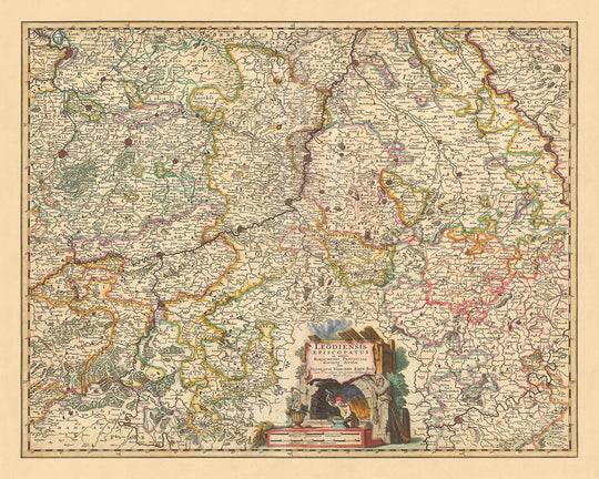Immerse yourself in the rich history of the Bishopric of Liège with this meticulously detailed map crafted by Nicolaes Visscher II in 1690. The map, officially titled 'Leodiensis Episcopatus in omnes subjacentes provincias distincte divisus', translates to 'The Bishopric of Liège, distinctly divided into all the underlying provinces'. This provides a fascinating glimpse into the political and geographical divisions of the time, specifically focusing on the Bishopric of Liège, a significant ecclesiastical territory within the modern-day area of Belgium.