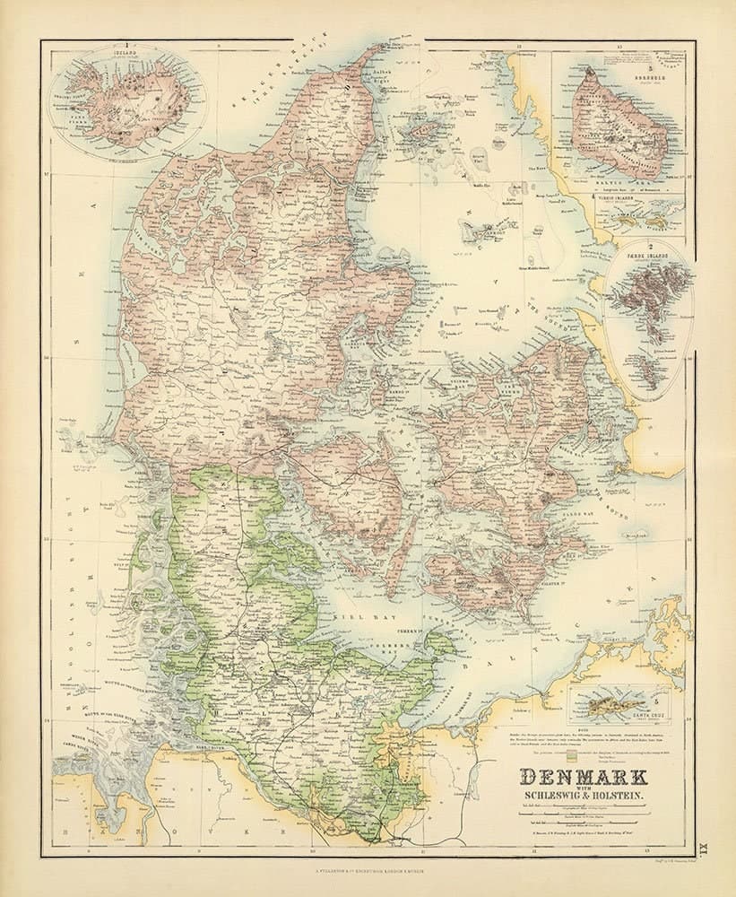 This old, full colour and wonderful map shows the Kingdom of Denmark and Schleswig-Holstein (now mostly part of Germany) as it was in 1872. It was engraved by G.H. Swanston and published by A. Fullarton & Co.