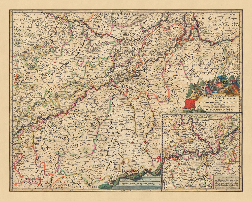 Immerse yourself in the rich history of Germany as depicted in this detailed map from the 17th century. Crafted by Nicolaes Visscher II, a renowned mapmaker from the Dutch Golden Age, this exquisite piece captures the Duchies of Jülich and Cleves & Berg, offering a unique glimpse into the political landscape of the era. The map, whose full name translates to 'Duchies of Jülich, Cleves, and Berg, as well as the Archbishopric of Cologne and other regions adjacent to the Rhine River', provides an in-depth view of these regions and their intricate divisions.
