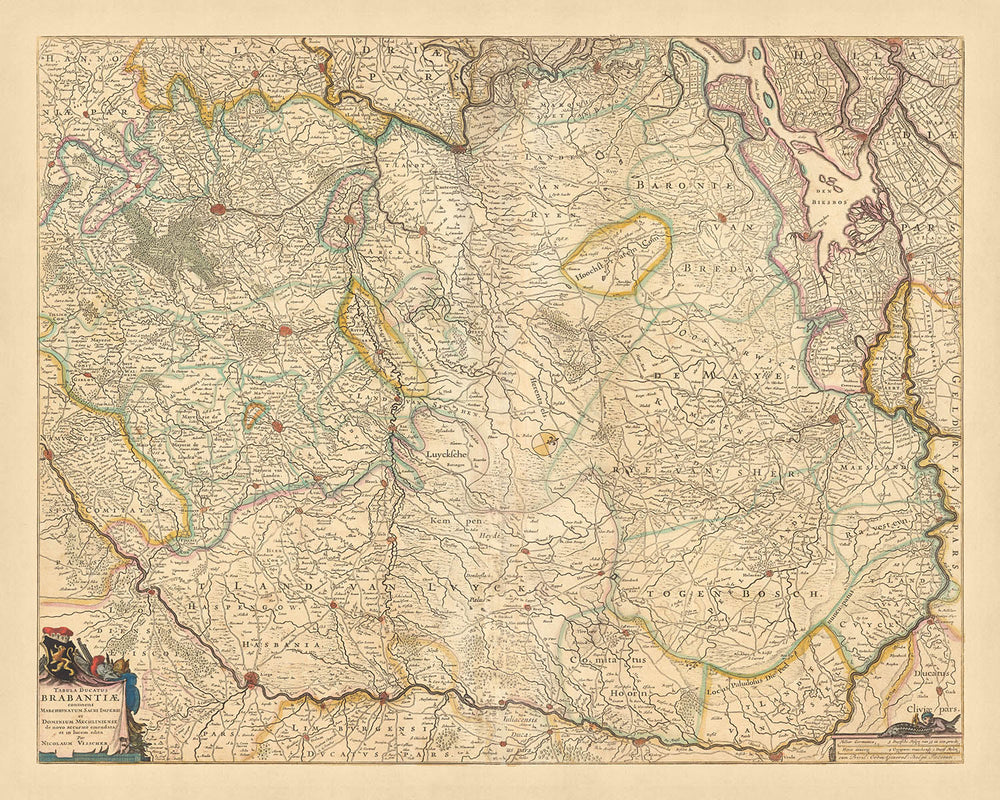 Old Map of Duchy of Brabant by Visscher, 1690: Brussels, Antwerp, Liège, Eindhoven, Hoge Kempen National Park